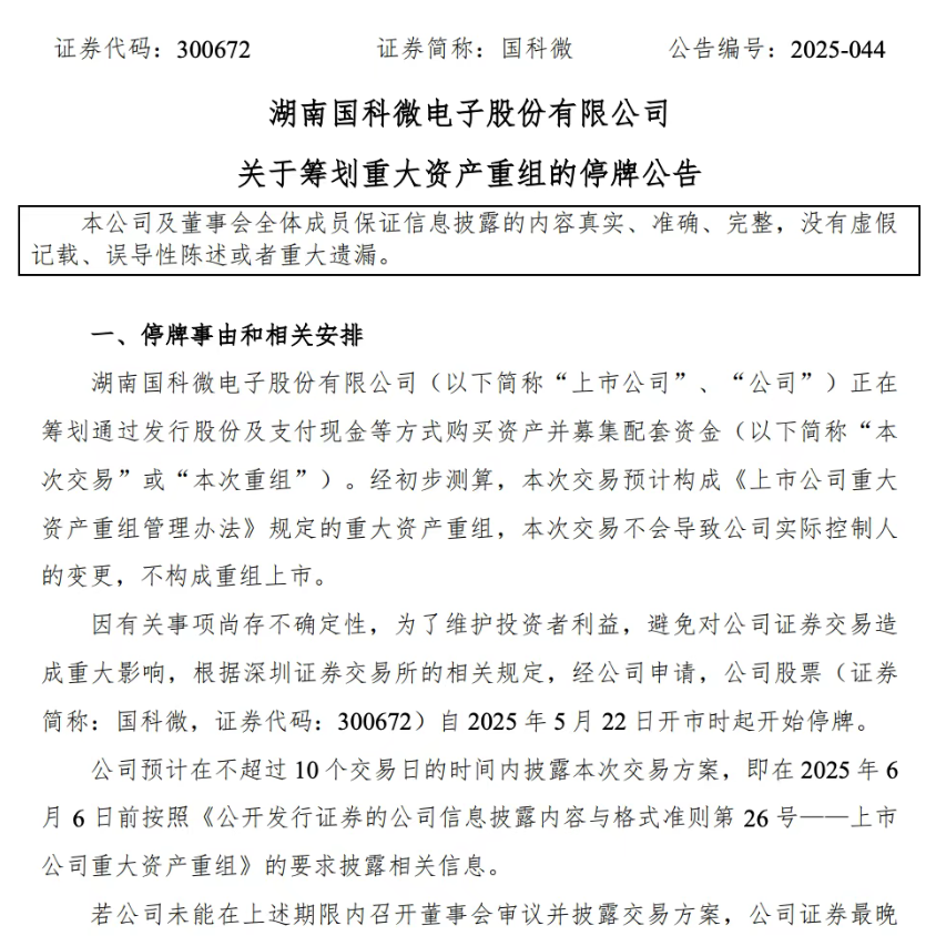 国科微股票5月22日起停牌,预计不超10个交易日披露交易方案,最晚6月6日开市起复牌。停牌前一日(5月20日)公司股价单日涨幅达12.54%,公司回应称不存在提前泄密情况,股价上涨为正常市场反应。截至5月21日收盘,公司股价81.06元/股,总市值176亿元。