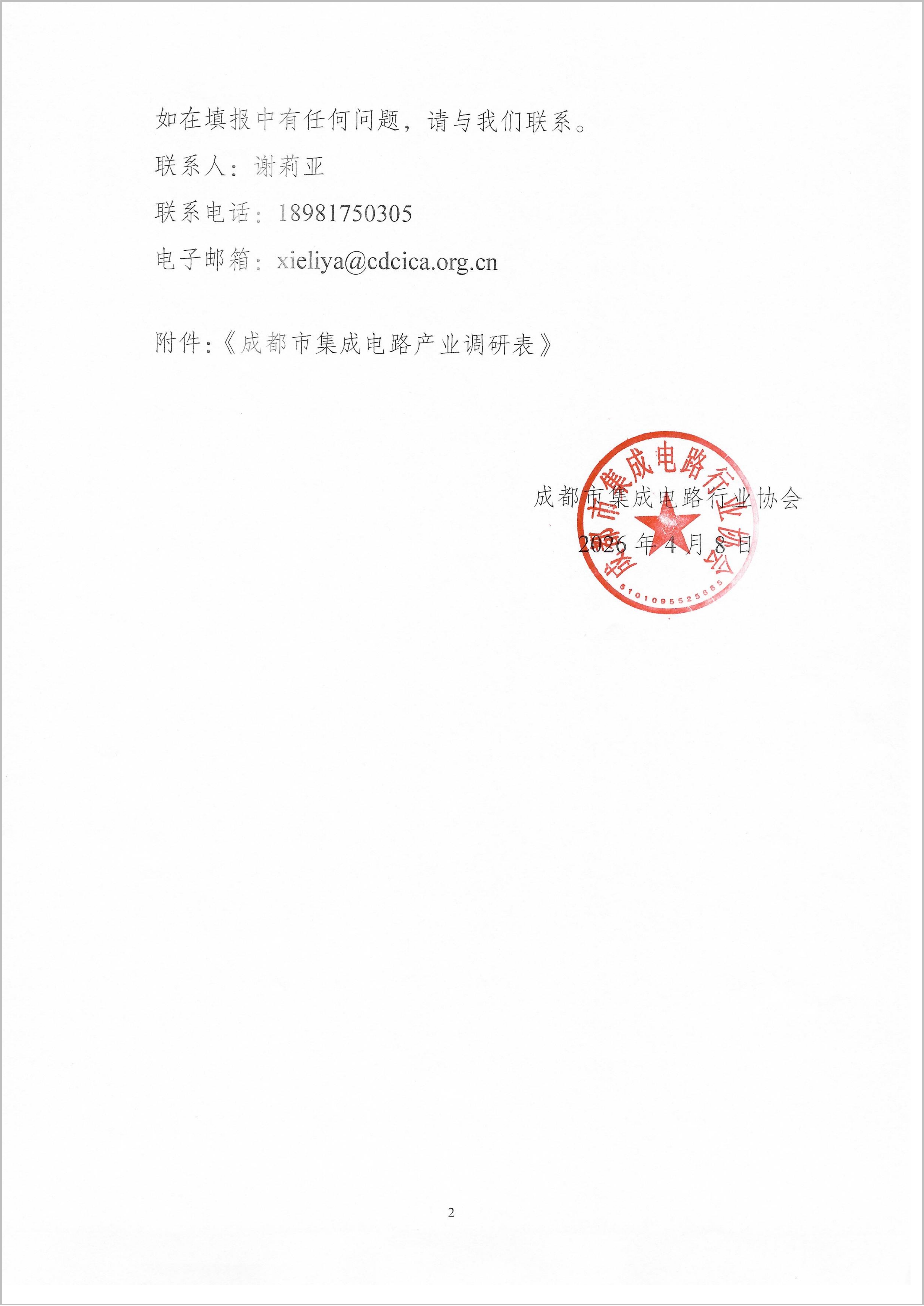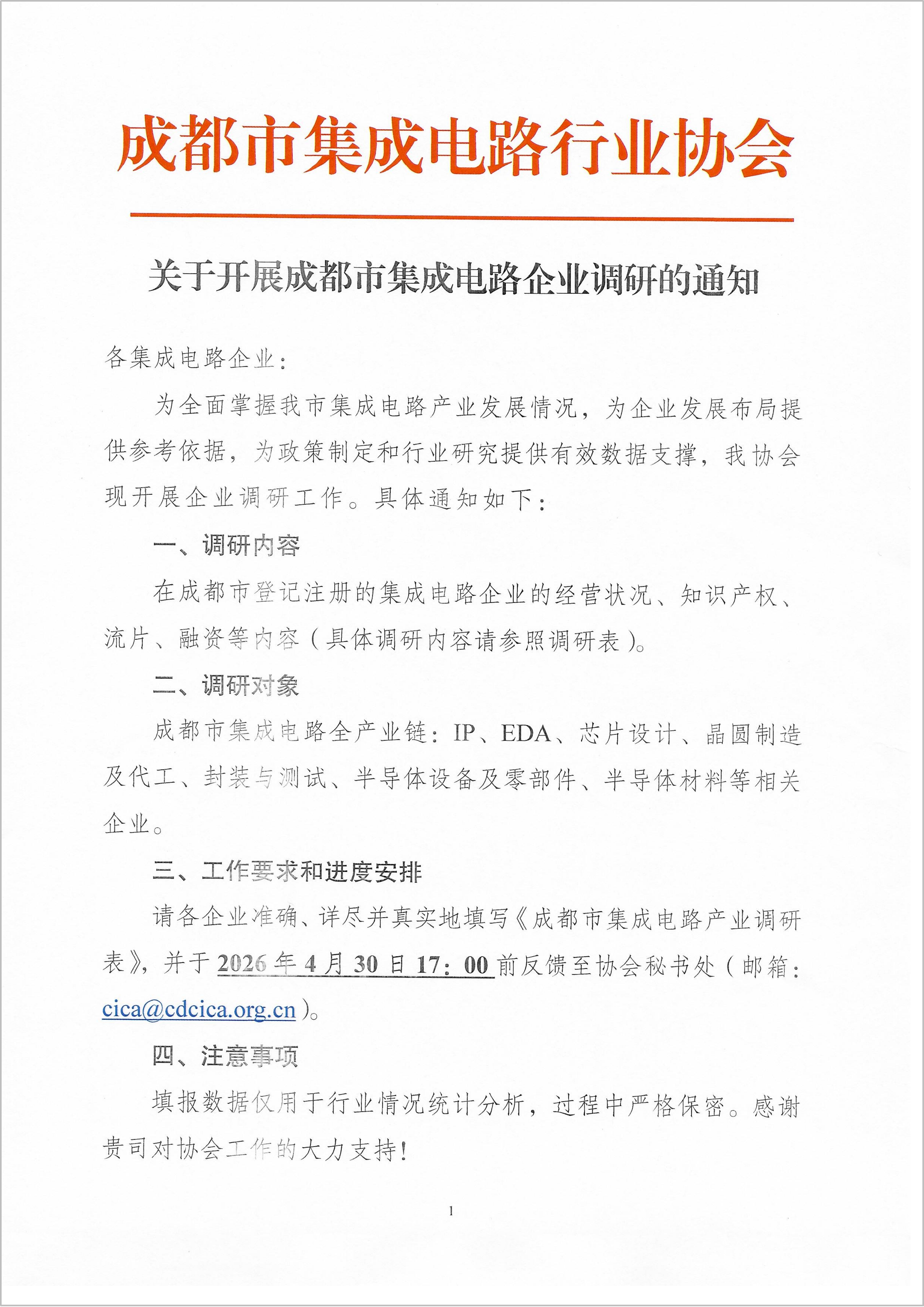 请下载并填写《成都市集成电路产业调研表》,于2026年4月30日17:00前反馈至邮箱:cica@cdcica.org.cn。