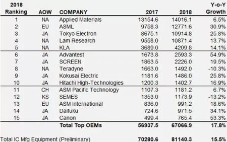 图:2018年全球半导体设备厂商营收排名,单位:百万美金(来源:VLSIResearch)