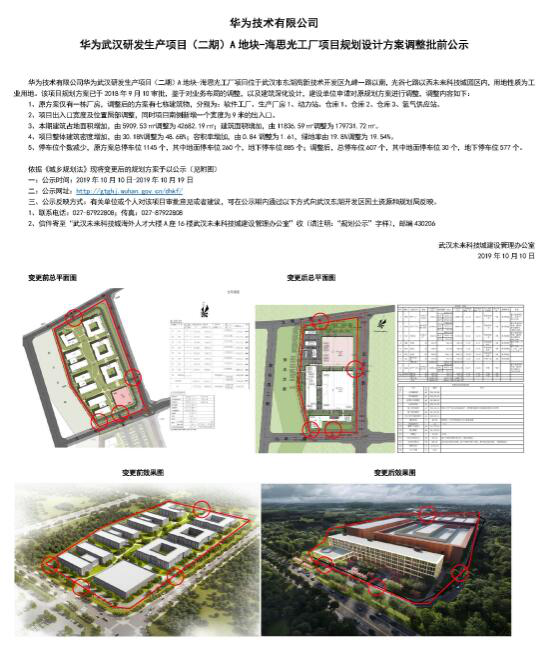 近日,武汉市国土资源和规划局对华为技术有限公司武汉研发生产项目(二期)A地块-海思光工厂项目规划设计方案调整进行批前公示。