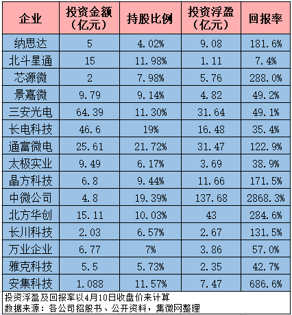 据集微网统计,大基金首批减持兆易创新、汇顶科技和国科微股份共计套现21.54亿元,对这三家公司的持股时间最少2年多,最长已达4年;按当时减持均价计算,大基金对这三家公司的持股浮盈合计为129.38亿元,回报率为276.45%。