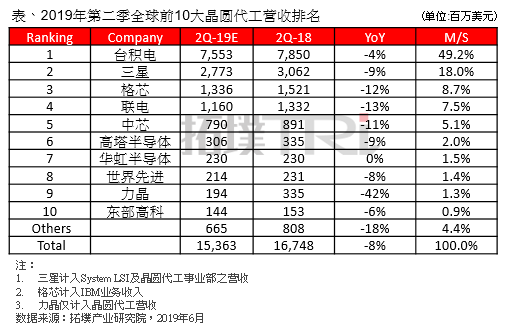 拓墣产业研究院还指出,2019年第二季晶圆代工业者排名前五与去年相同,第六名至第十名则略有变动:力晶因存储器和显示驱动芯片代工需求下滑,排名与去年同期相比由第七名下降至第九名;显示驱动芯片转移至12寸投产的趋势愈加明显,使得不具有12寸产能的世界先进营收受冲击,排名被华虹半导体超越,滑落至第八名。