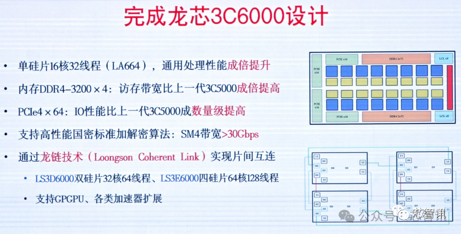 根据龙芯中科此前公布的信息显示,龙芯3C6000单芯片为16核32线程(LA664),通用处理性能得到了成倍提升。同时配备的DDR4-3200x4接口,使得访存带宽比上一代3C5000成倍提高;PCle4×64的IO性能比上一代3C5000成数量级提高。龙芯3C6000还支持高性能国密标准加解密算法(SM4带宽>30Gbps)。