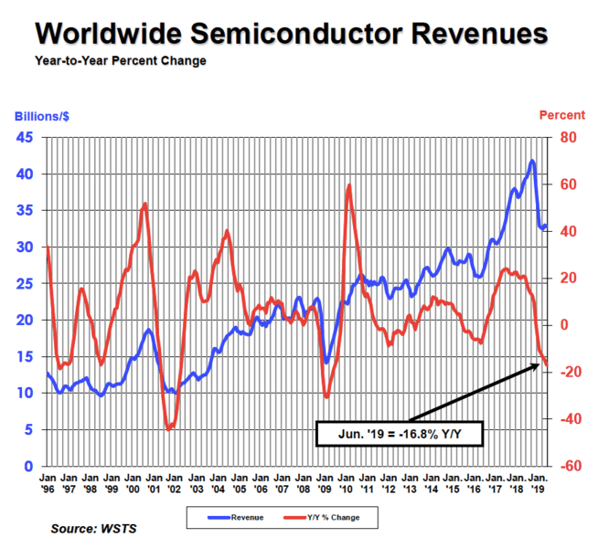 “在2019年的中期,全球半导体市场仍处于销售下滑期,6月份的收入比去年同期下降了近15%,”SIA总裁兼首席执行官John Neuffer表示。