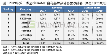 SK海力士的销售位元出货量成长约13%,然而受报价下跌影响,第二季营收为42.6亿美元,季减12.6%,市占为28.7%;至于美光仍旧排名第三,不过受到中美贸易议题影响,美光第二季位元出货量仅持平前一季,营收为30.4亿美元,较上季下滑19.1%,市占率亦有所流失,下跌至20.5%。
