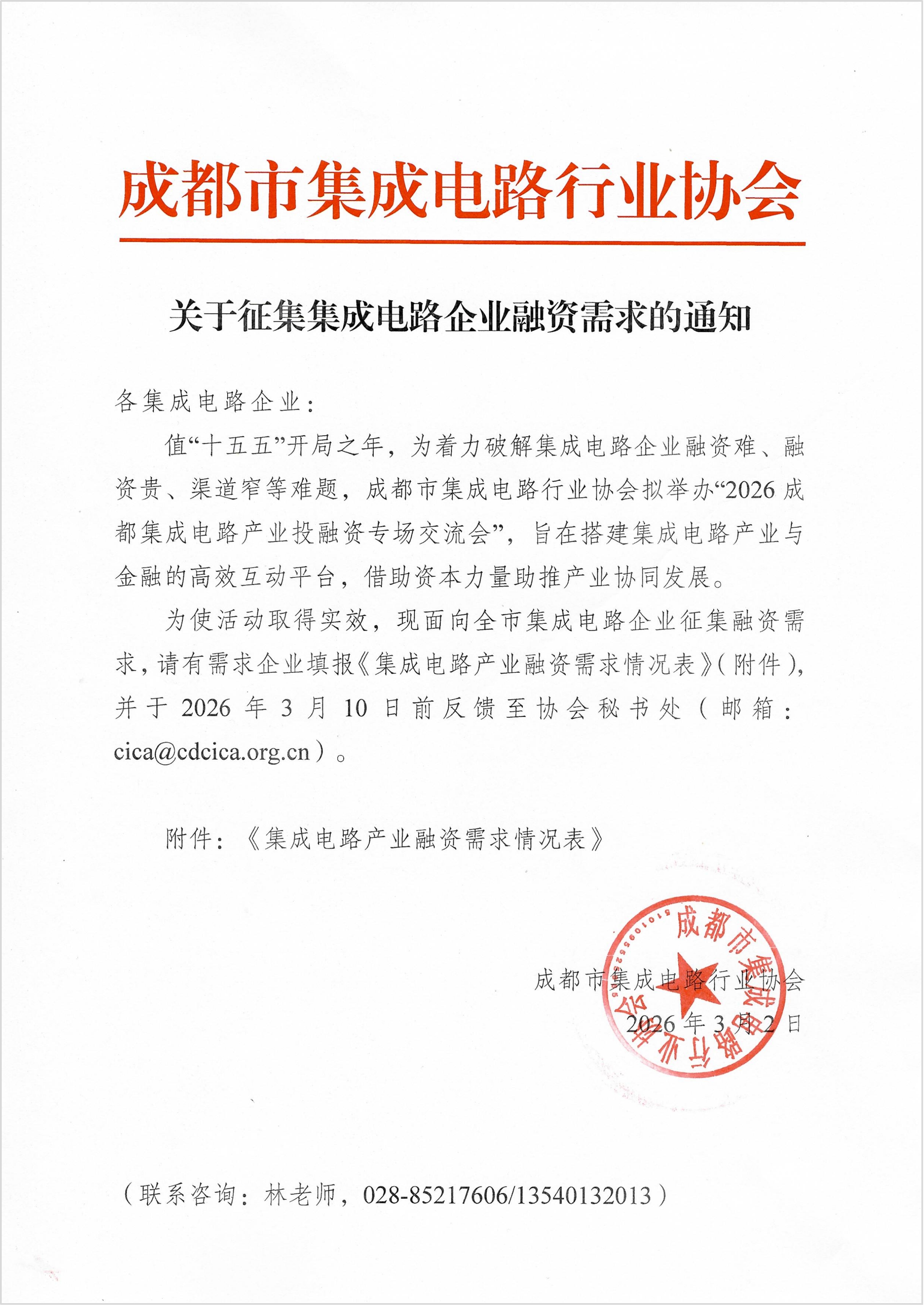 下载并填写《集成电路产业融资需求情况表》,于3月10日17:00前反馈至我协会邮箱(cica@cdcica.org.cn)。