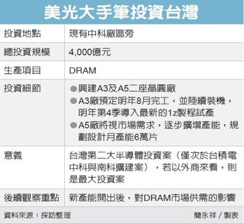全球第三大DRAM厂美商美光(Micron)加码投资中国台湾地区,要在现有中科厂区旁兴建两座晶圆厂,总投资额达新台币4,000亿元(约合人民币903亿元),以生产下世代最新制程生产DRAM。时值DRAM仍供过于求,美光大手笔投资,震撼业界。
