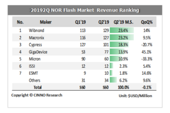 根据CINNO Research的数据,在第二季度中兆易创新NOR Flash业绩攀升,环比劲升45%营收增至7700万美元。CINNO Research分析说,这一增速是所有厂商中最高的。