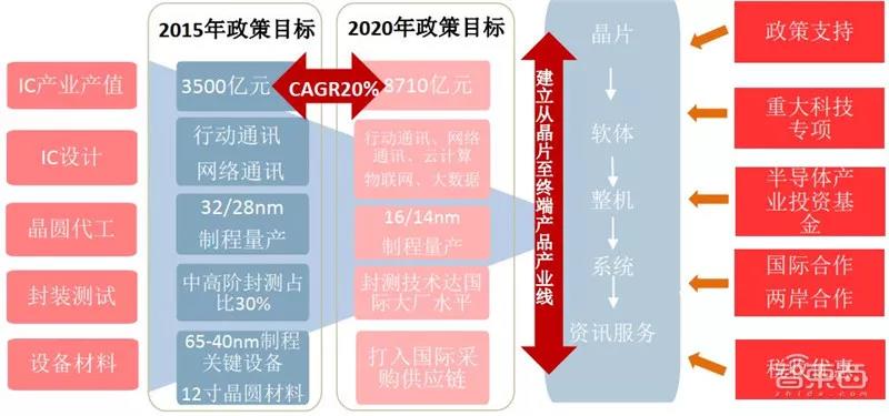 到2020年,集成电路产业与国际先进水平的差距逐步缩小,全行业销售收入年均增速超过20%,企业可持续发展能力大幅增强。移动智能终端、网络通信、云计算、物联网、大数据等重点领域集成电路设计技术达到国际领先水平,产业生态体系初步形成。16/14nm制造工艺实现规模量产,封装测试技术达到国际领先水平,关键装备和材料进入国际采购体系,基本建成技术先进、安全可靠的集成电路产业体系。