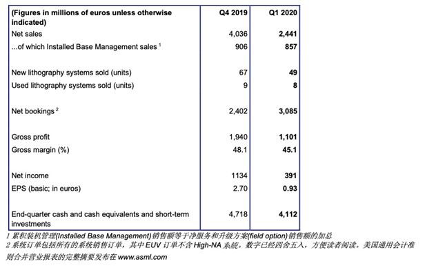 集微网消息,今日ASML发布2020年第一季度财报。Q1实现净订单额31亿欧元,净销售额24亿欧元,毛利率为45.1%,净利润4亿欧元。同比2019年Q1净销售额22亿欧元,毛利率41.6%,净收入3.55亿欧元,均实现了一定幅度的增长。