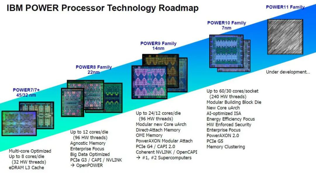 IBM的一些内部路线图详细介绍了Power10芯片的核心数量,并且几乎所有人都说Power10将具有48个内核。这是合乎逻辑的,因为Power8在每个裸片的相同96个线程中最大化了12个内核,而Power9在24个“瘦”内核(或12个“胖”内核)中最大化,制程从Power8的22nm缩小到Power9的14nm。合理的假设是,当缩小到7nm时,核心数量可能会再次增加一倍。