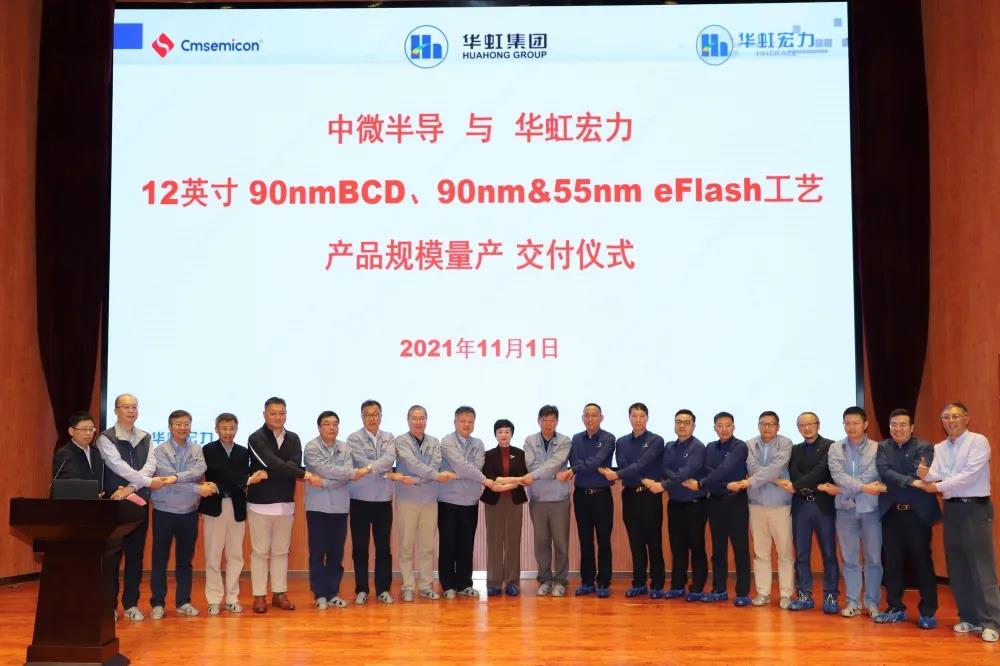 全球领先的特色工艺纯晶圆代工企业——华虹半导体有限公司(“华虹半导体”,股份代号:1347.HK)与中国MCU行业的知名企业——中微半导体(深圳)股份有限公司(“中微半导”)近日举办产品交付仪式,共同庆祝90纳米eFlash MCU、90纳米BCD电机驱动、55纳米eFlash MCU等产品在华虹七厂12英寸生产线实现规模量产,标志着华虹半导体与中微半导合作进入新阶段。华虹集团党委书记、董事长张素心,华虹集团党委副书记、总裁王靖,华虹半导体总裁兼执行董事唐均君、中微半导总经理周彦等双方高层出席。