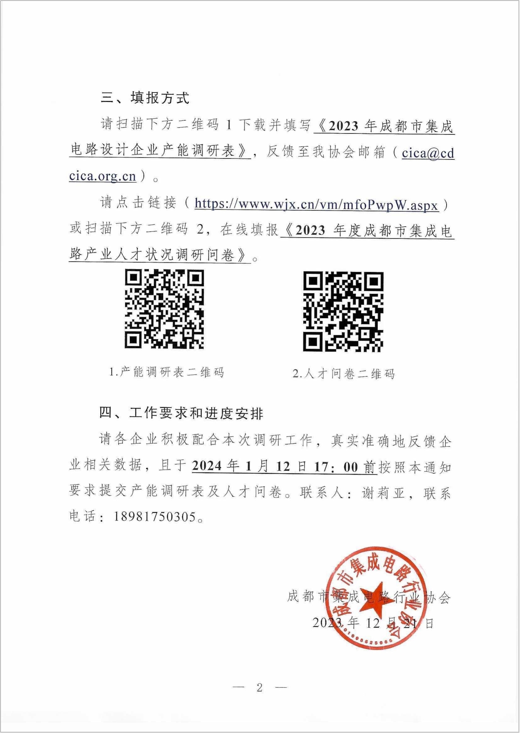 请扫描下方二维码1下载并填写《2023年成都市集成电路设计企业产能调研表》,反馈至我协会邮箱(cica@cdcica.org.cn)。