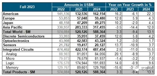 WSTS表示,2024年所有市场都有望增长,欧洲及日本市场将分别成长4.3%及4.4%,美洲市场将成长22.3%,亚太地区成长12%。