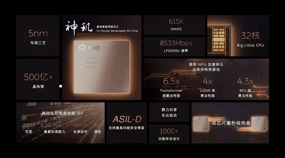 12月23日,蔚来汽车发布首颗自研智能驾驶芯片——神玑NX9031。据介绍,神玑NX9031采用5nm车规工艺制程,有超过500亿颗晶体管,通过自研的推理加速单元NPU,可灵活高效地运行各类AI算法。蔚来期望用一颗自研芯片实现目前业界四颗旗舰智能驾驶芯片的性能,使得效率和成本更优。目前,蔚来汽车已量产车型搭载的英伟达OrinX智驾芯片,制程为7纳米,单颗算力为128TOPS。