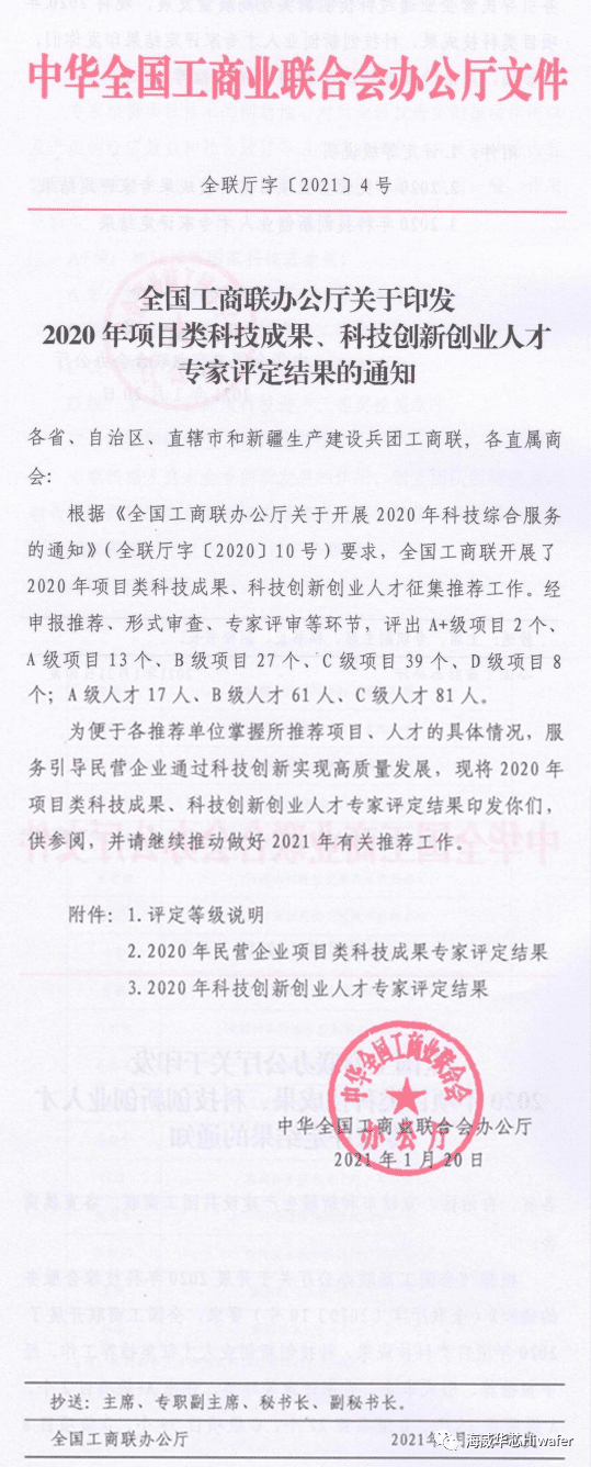 喜报!海威华芯获全国工商联2020年民营企业“A级项目”科技成果奖