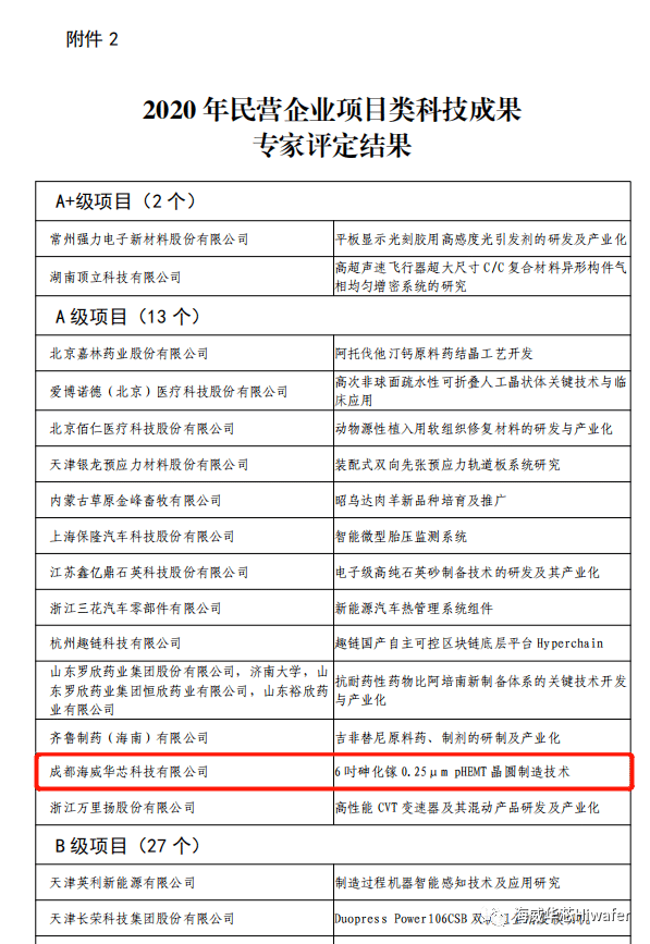 日前,全国工商联办公厅公布“2020年项目类科技成果、科技创新创业人才专家评定结果”,海威华芯申报的“6吋砷化镓0.25μm pHEMT晶圆制造技术”项目,经专家评定,获得2020年民营企业项目类科技成果A级项目奖,此次评定经过了省、市工商联推荐、形式审查、专家评审和公示等环节,全国共有13家企业的13个项目获得A级项目奖。