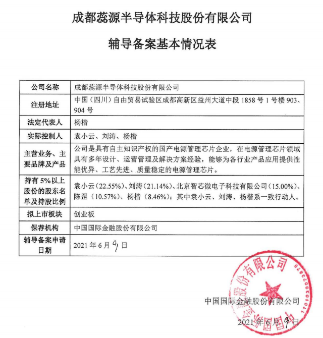 6月15日,四川证监局披露了成都蕊源半导体科技股份有限公司辅导备案基本情况表。信息显示,成都蕊源半导体科技股份有限公司(以下简称“蕊源半导体”)拟上市板块为创业板,保荐机构为中国国际金融股份有限公司,已于6月9日申请辅导备案。